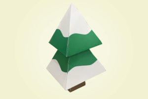 背景素材第2弾は雪の積もるもみの木のペーパークラフト。三角錐を2つ重ねる構造により”キャラだち”らしい立体感で設計しています。